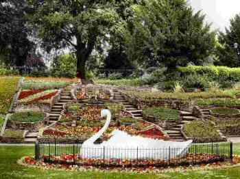 Stapenhill Gardens is a popular local park with formal gardens, open grassland, woodland and a popular play area. The site was gifted to Burton Corporation in 1933 by Henry Goodger, a local solicitor, as a pleasure ground in memory of his mother. Part of the ground was lost with the construction of the access road for St Peter’s Bridge. The focal point is the gigantic model swan planted with flowers. It was built in 1953, coronation year, by members of the old Burton Corporation Parks Department. The construction alludes to the swans that inhabit the gardens and river at this point. At the rear is St Peter’s Church which may have had minster status during the Anglo-Saxon period.
