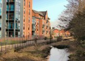Markeaton Brook played an important role in the early industrial development of Derby providing power for several mills along its course. The stretch of the brook along what is now called Brook Walk was where boats used to transport goods to and from factories along the bankside. The stone steps to a former landing stage can still be seen near the end of Searl Street at the back of what are now University student lodgings. The cast-iron bridge that crossed the brook and gave access to Searl Street has been replaced with a modern one of similar style mainly for the use of the student population.