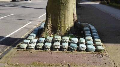 Near the front of the former Large’s Hospital is a collection of stoneware heads, planted at the base of London plane trees which have graced this elegant Georgian Street since the 1860s. The heads are intended to represent the figures in the crowds that gathered in Derby at the time of the Reform Bill of 1831 when a considerable amount of rioting took place in the town. They were designed by Timothy Clapcott and installed in 2000 by the Sustrans cycle network and are certainly worth close inspection.