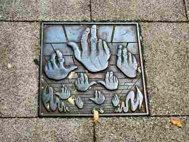 To the rear of the electrical transformer, where the Royal Institution for the Deaf and Dumb used to stand are cast-iron slabs embedded in the pavement, illustrating ‘Signing’ Hands, the signals used to communicate by teachers and pupils. The slabs were created as part of a community programme with the Royal School for the Deaf and Dumb to commemorate the school.