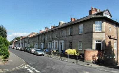 North Parade, numbered one to sixteen, is a Grade II listed terrace. The land was sold to the North Parade Building Club between 1818 and 1822 when William Strutt began selling off parts of his St Helen’s House estate. The properties have been built in two lots of eight on a descending site, which provides an extra storey at the rear. Ashlar faced and of substantial design, they were built by William Smith of Derby. Most of the development behind St Helen’s House, known as the Derwent Park Estate, took place in the 19th century.